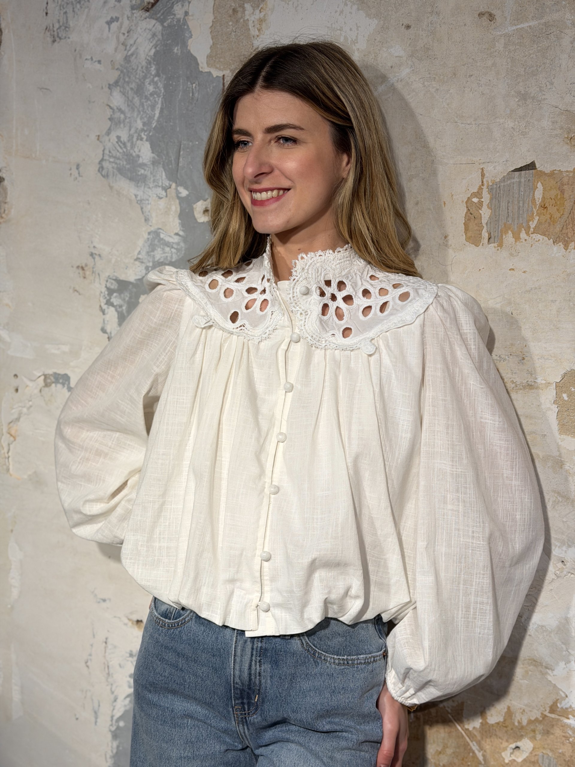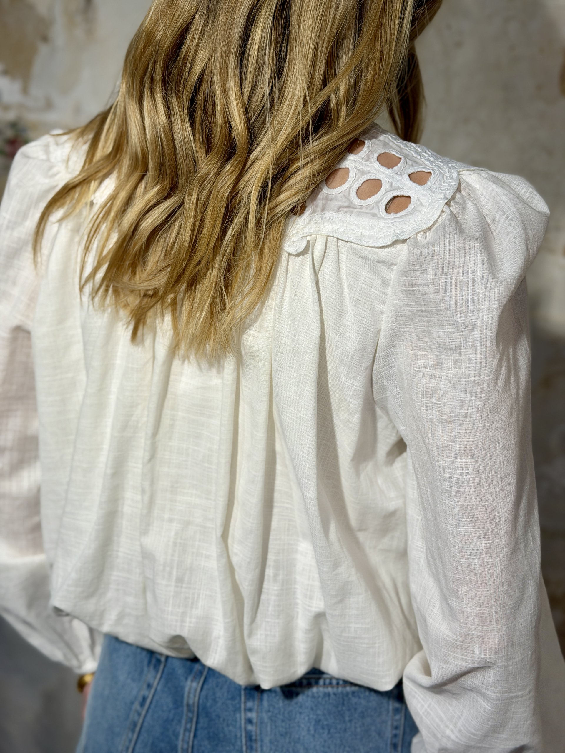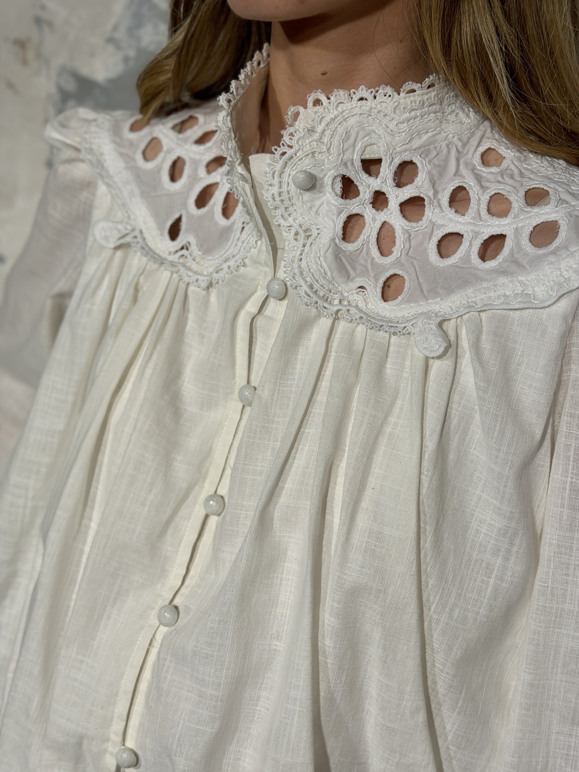 avec une jolie broderie anglaise ajourée aux épaules et décolleté