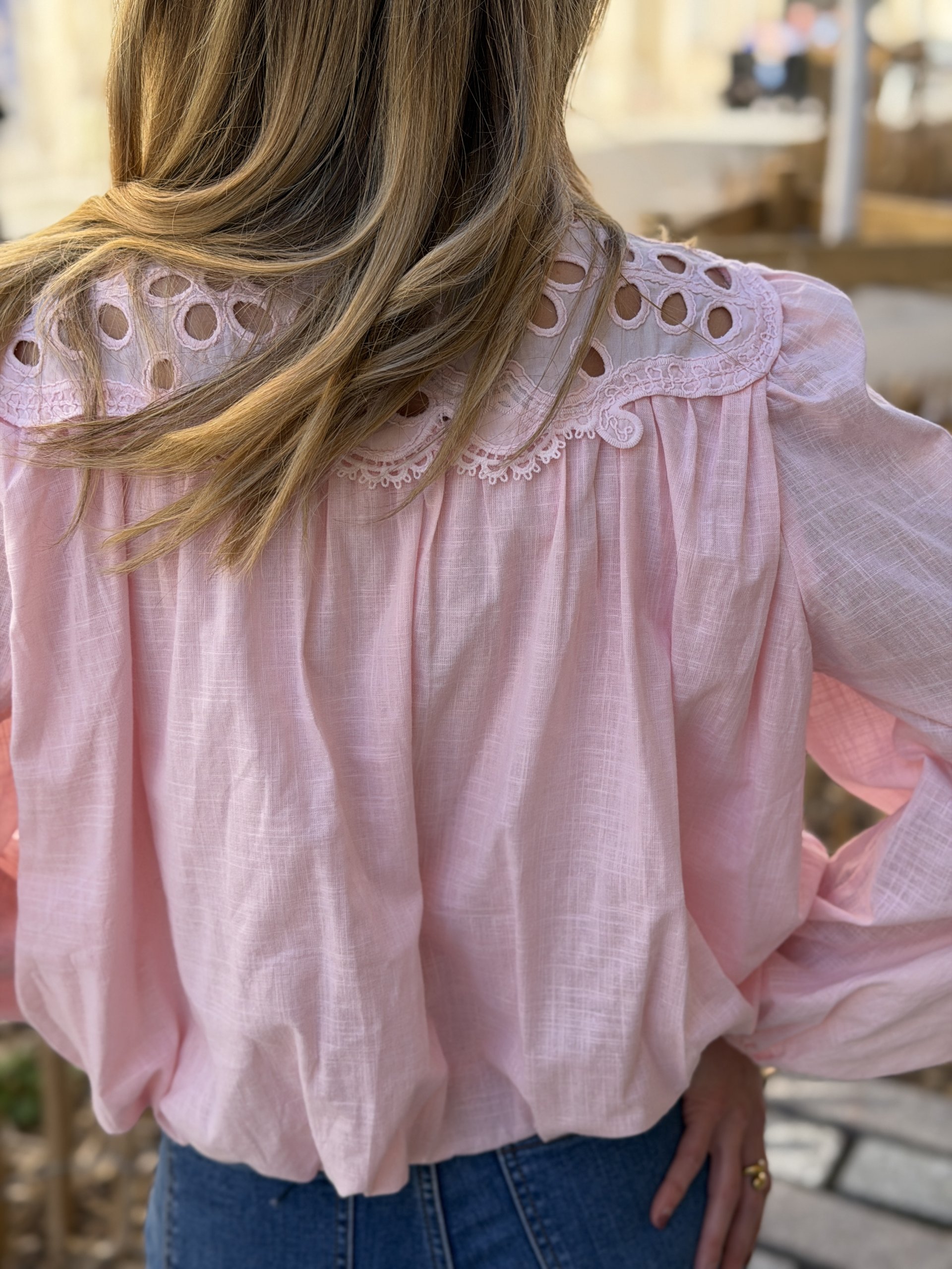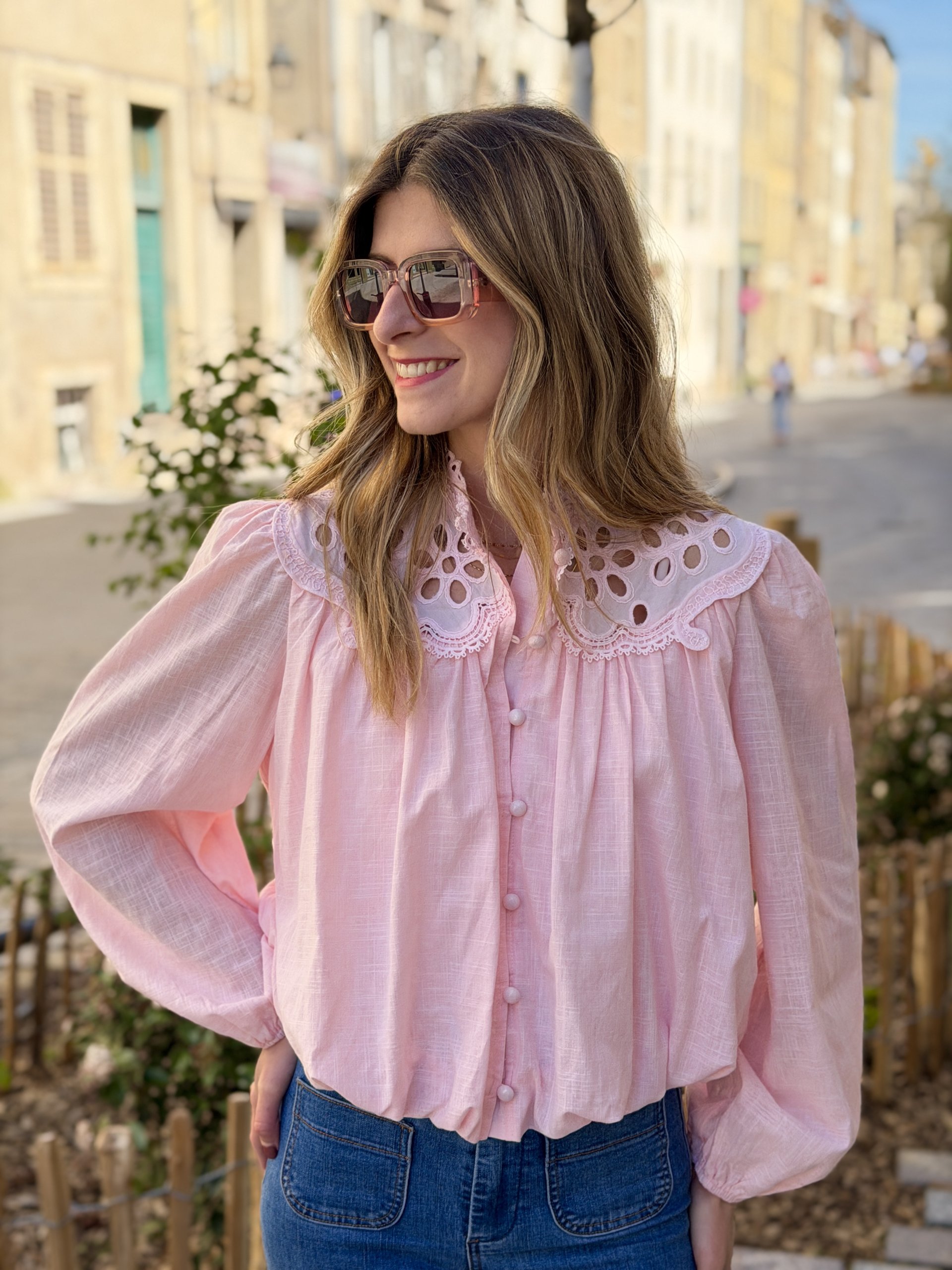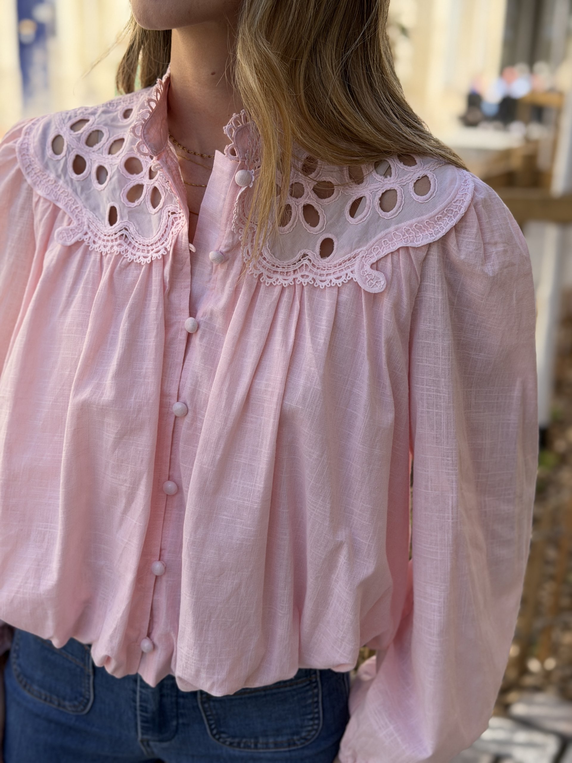 avec une jolie broderie anglaise ajourée aux épaules et décolleté