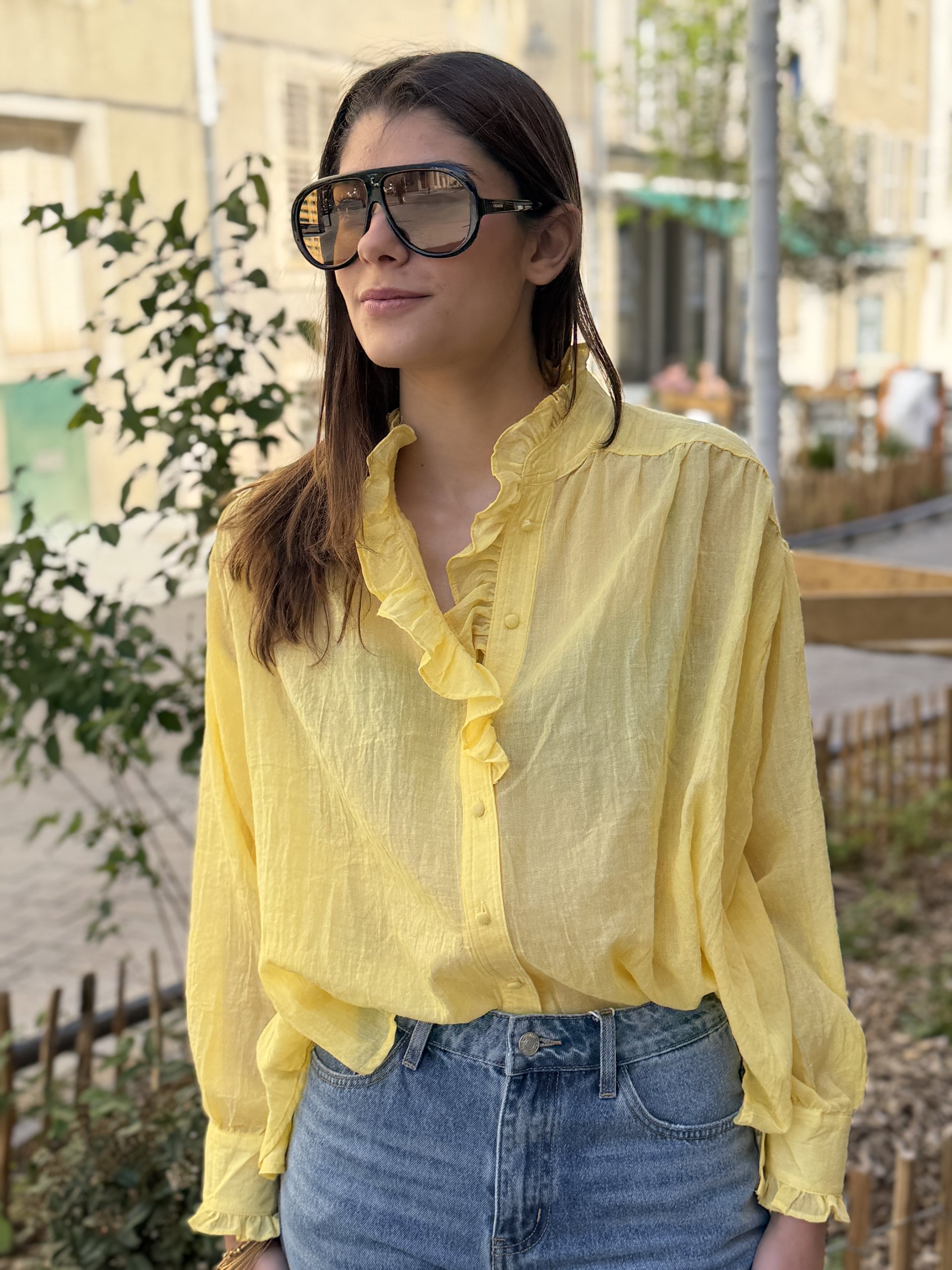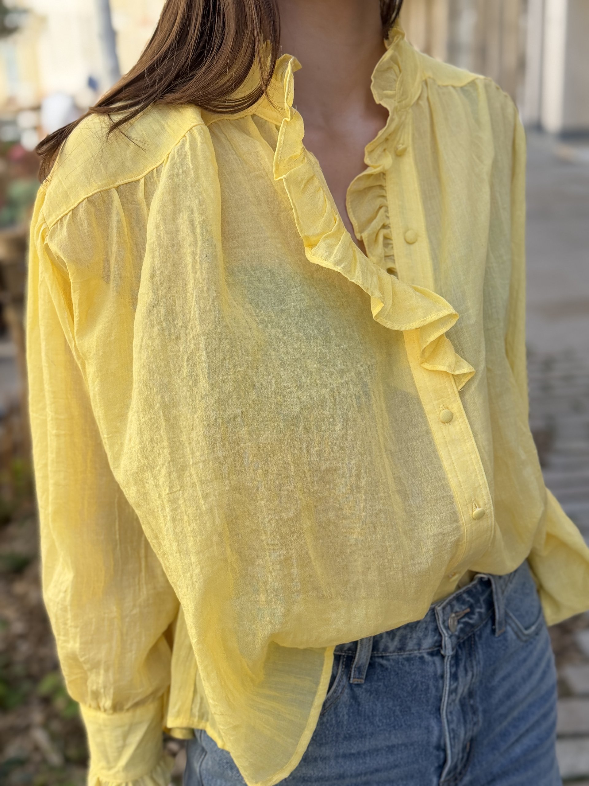 avec joli détail de volants aux poignées , sur le haut du décolleté et au col