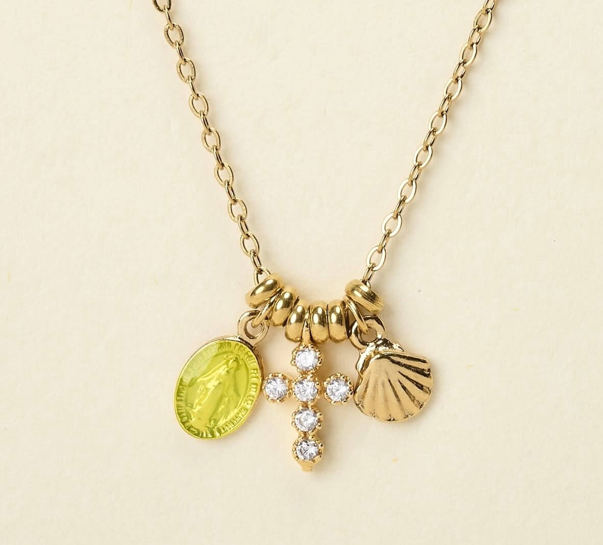 Ce collier réunit trois symboles puissants : la Vierge Miraculeuse, protectrice et bienveillante, le coquillage, messager du voyage intérieur et la croix, la foi silencieuse.