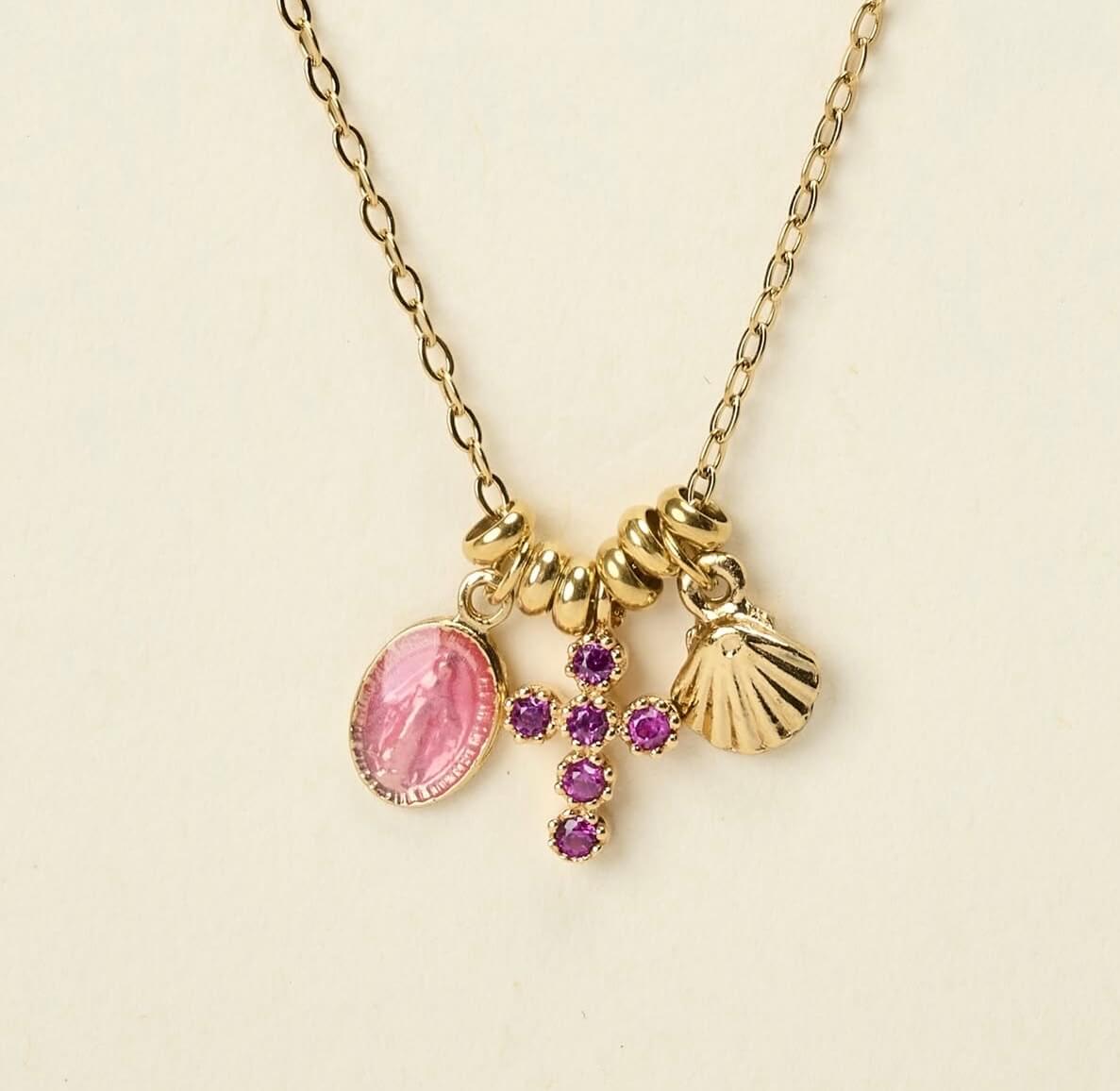 Ce collier réunit trois symboles puissants : la Vierge Miraculeuse, protectrice et bienveillante, le coquillage, messager du voyage intérieur et la croix, la foi silencieuse.