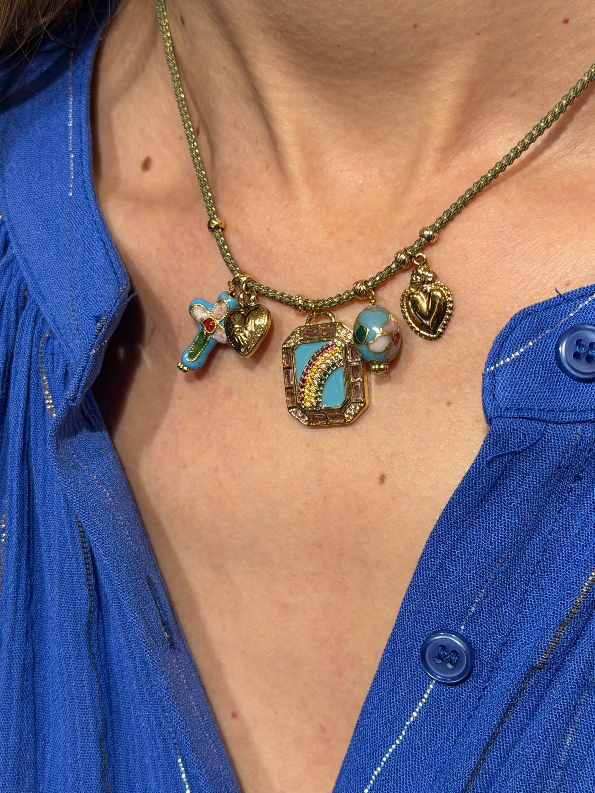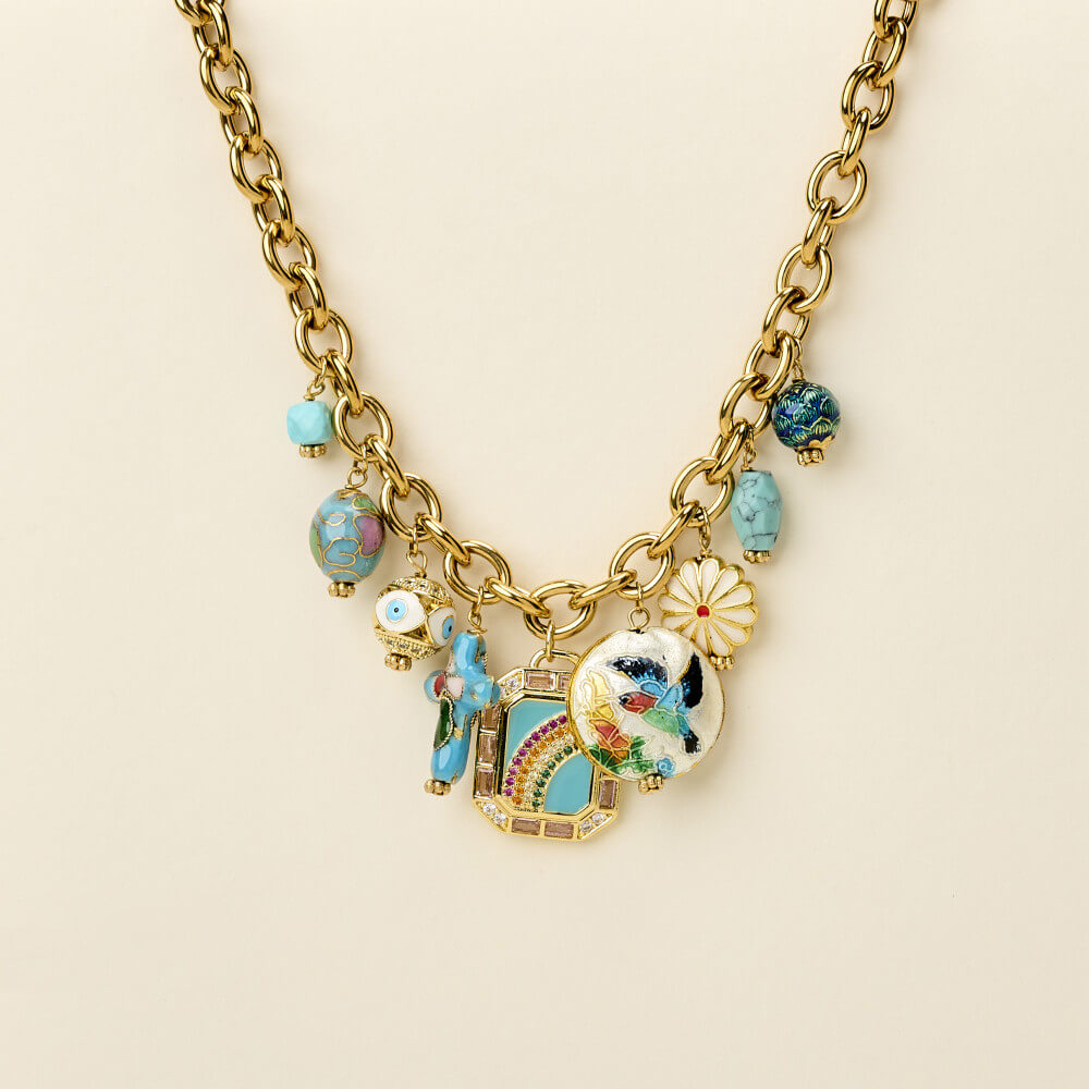 Le collier Charms Javi associe une chaîne en acier inoxydable à une sélection de charms éclectiques, soigneusement assemblés pour créer un bijou original et unique.