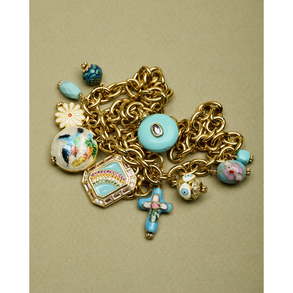 Ce modèle réunit une croix émaillée, des perles en émail cloisonné, une médaille centrale sertie d’oxydes de zirconium multicolores ainsi que des perles en turquoise, apportant une touche lumineuse et colorée.