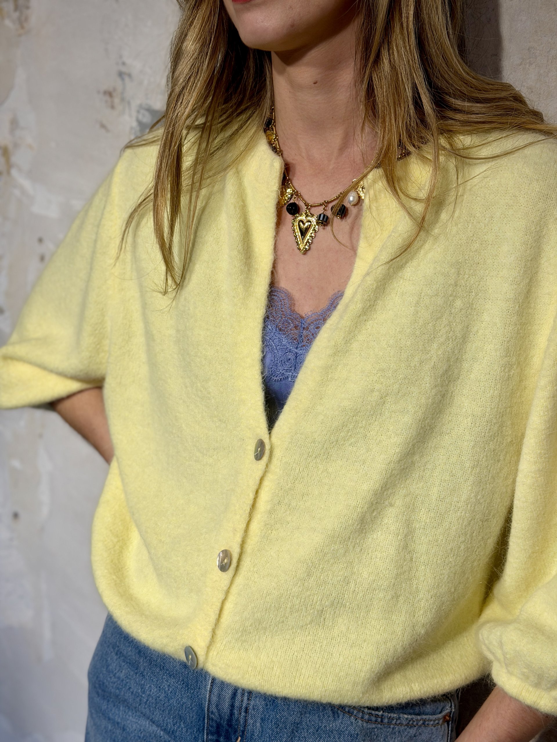 Joli pull gilet court très doux , idéal sur une petite robe ou pantalon large taille haute