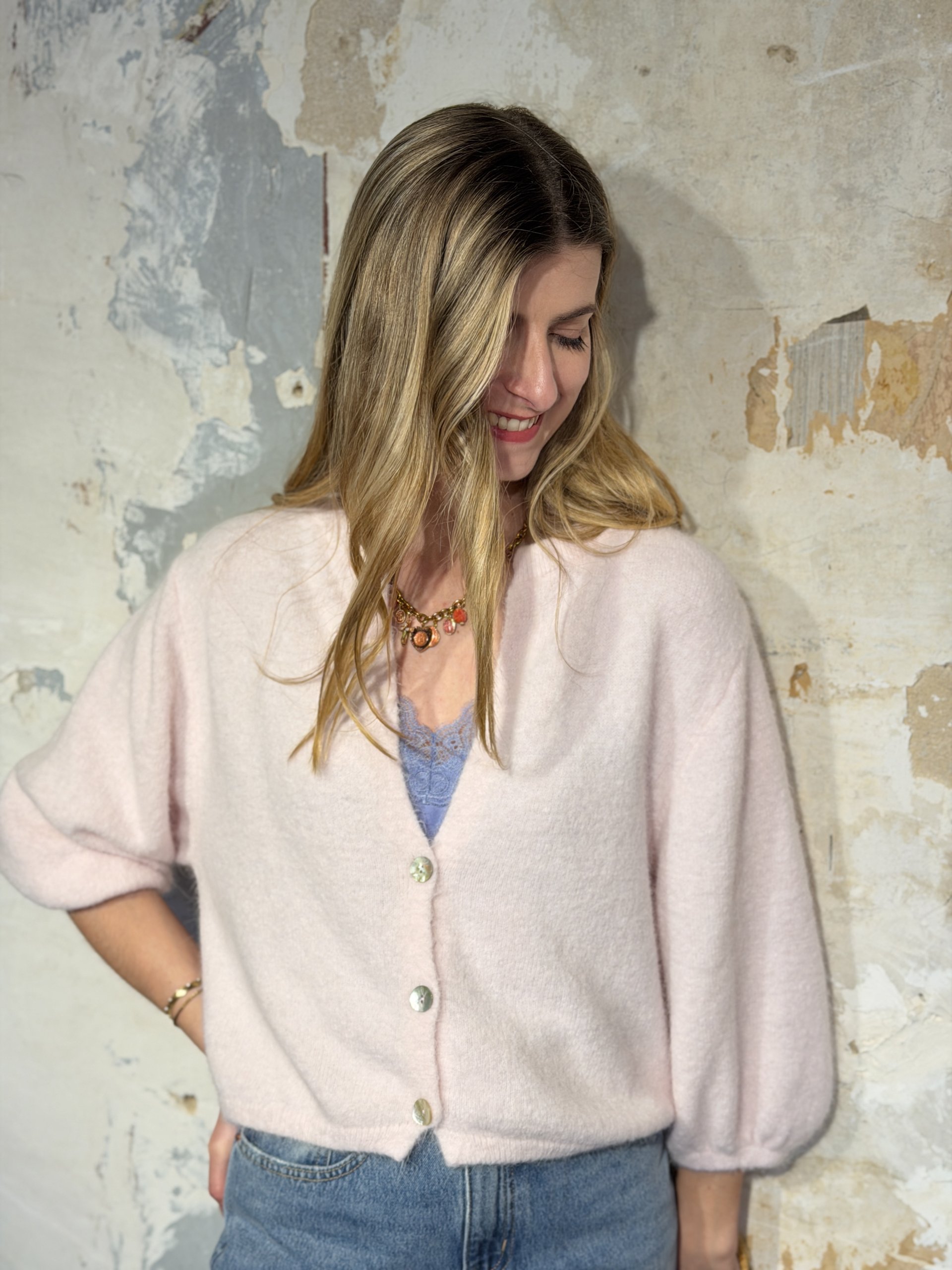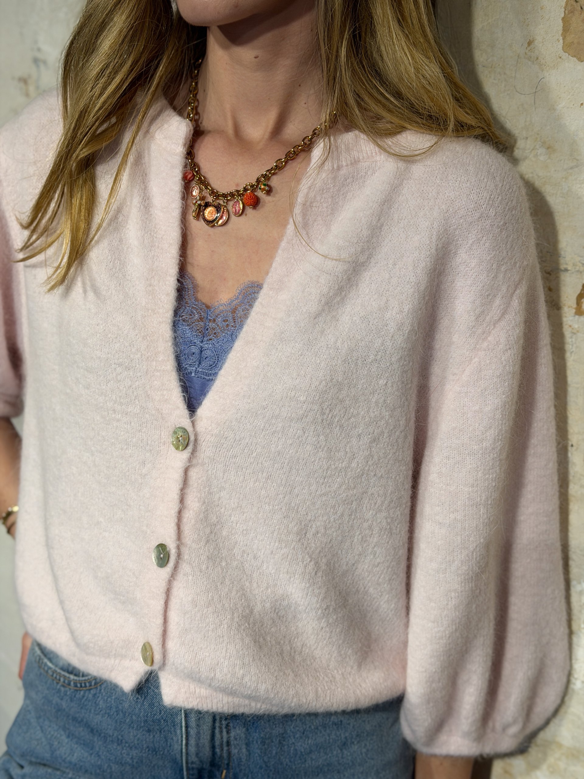 Joli pull gilet court très doux , idéal sur une petite robe ou pantalon large taille haute