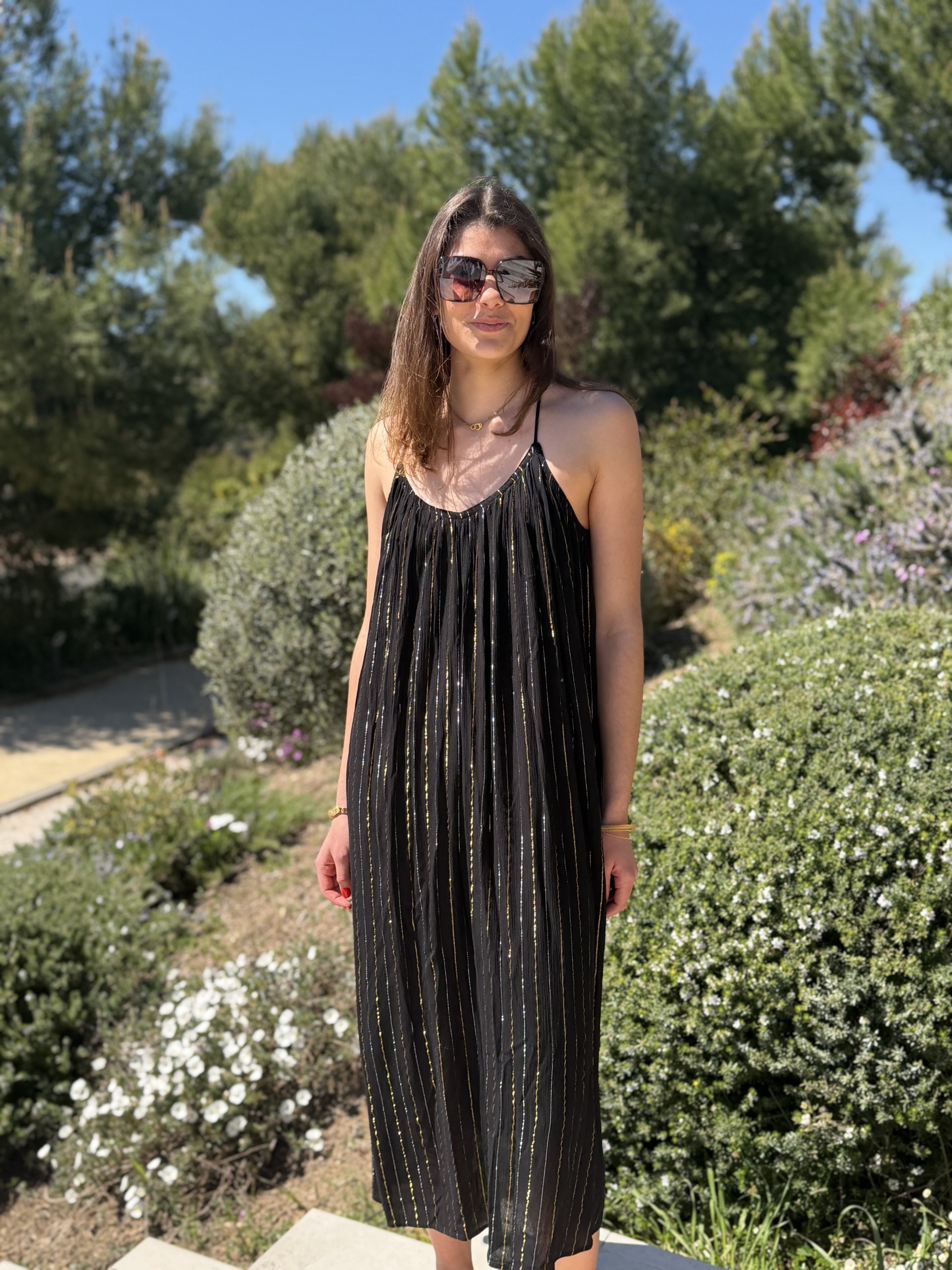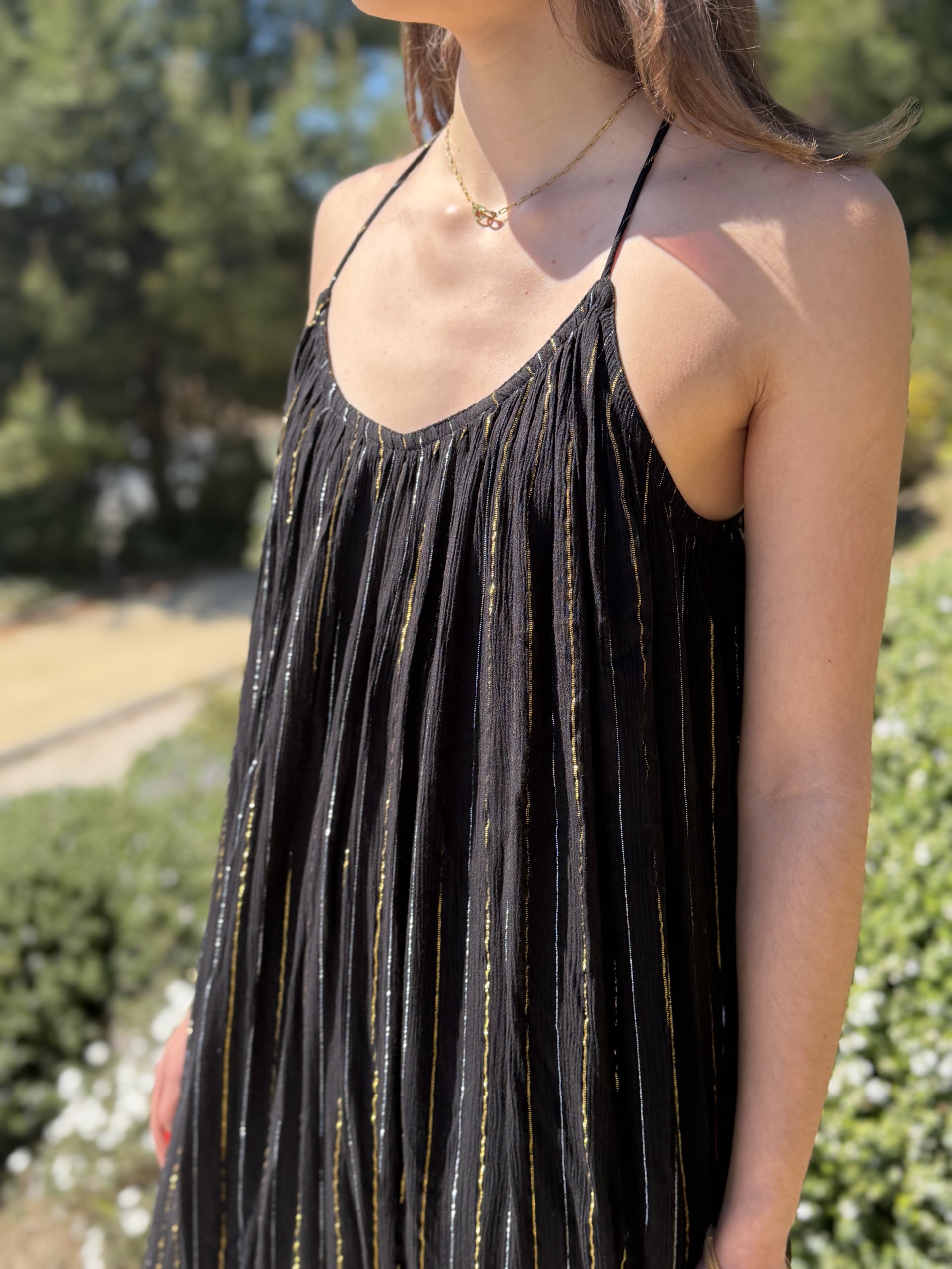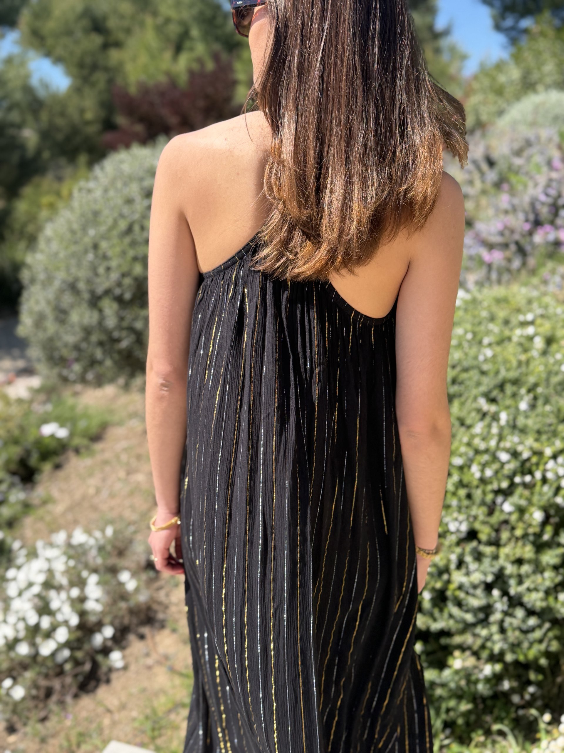 Sa coupe aérienne et son noir intemporel en font une pièce chic et facile à porter, les fils en lurex dorés apportent une touche de sophistication.