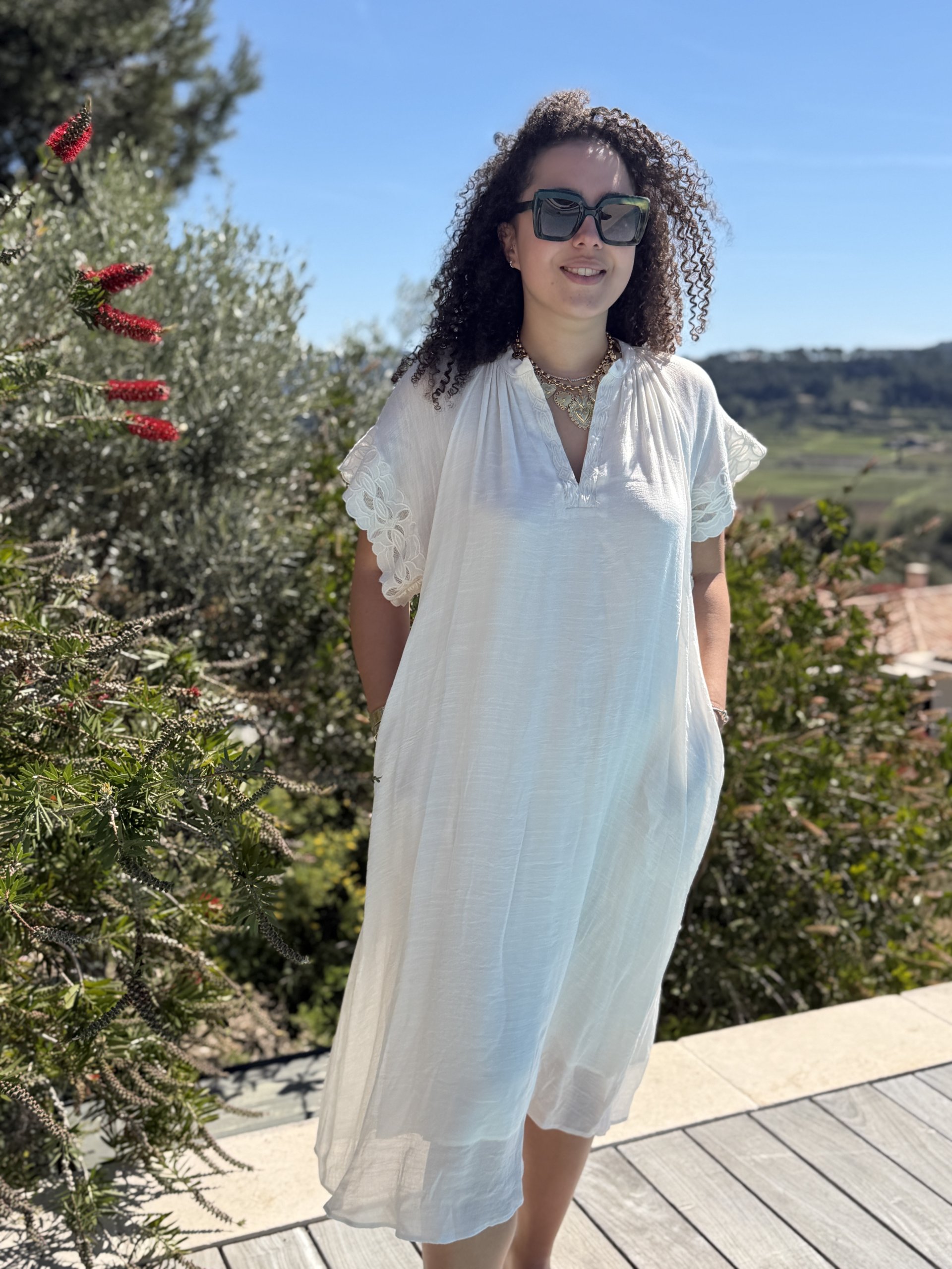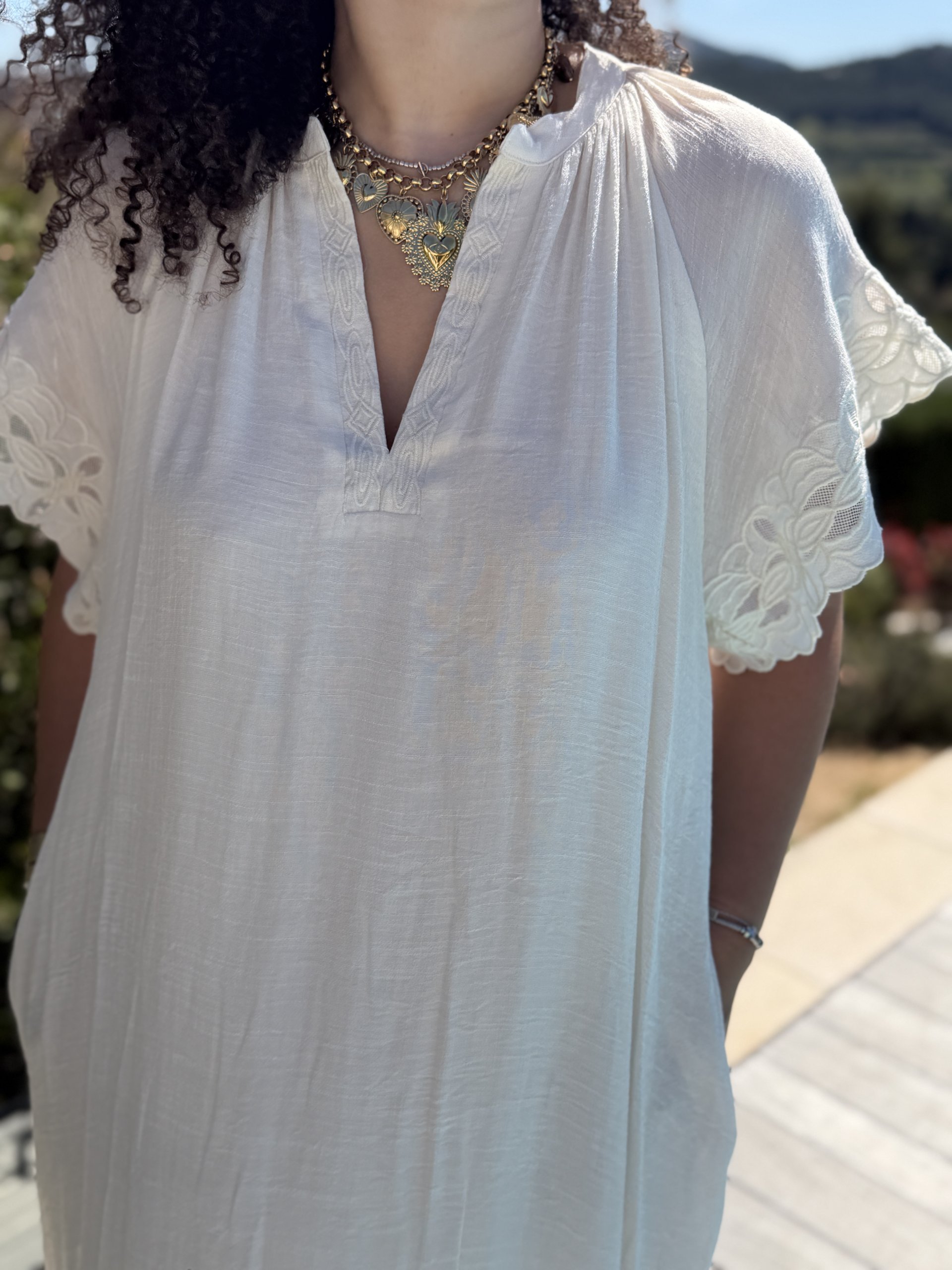 Robe droite avec de jolies broderies ton sur ton aux manches